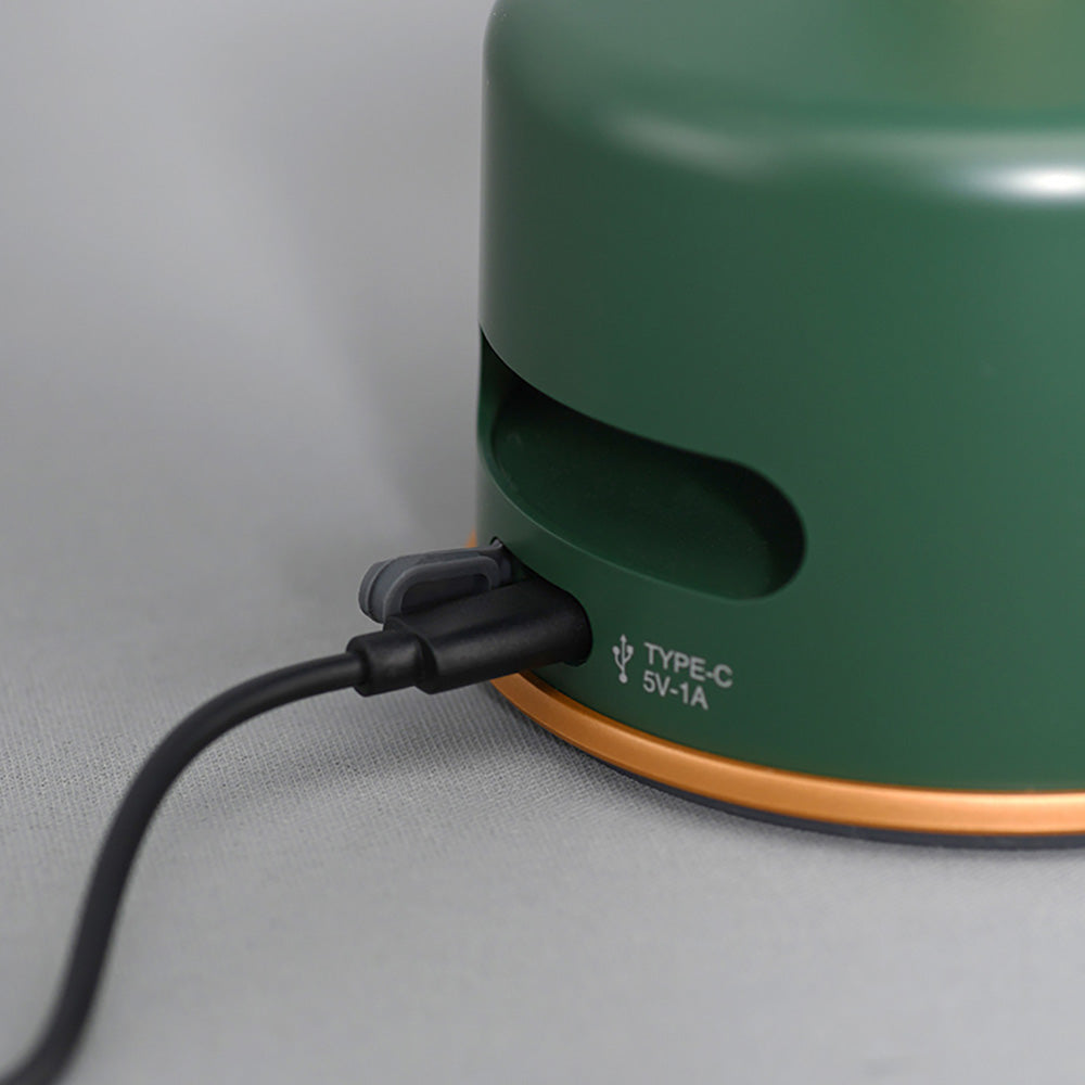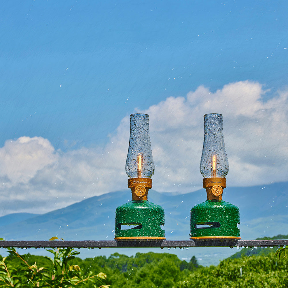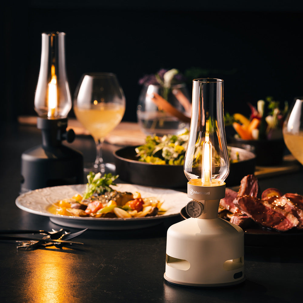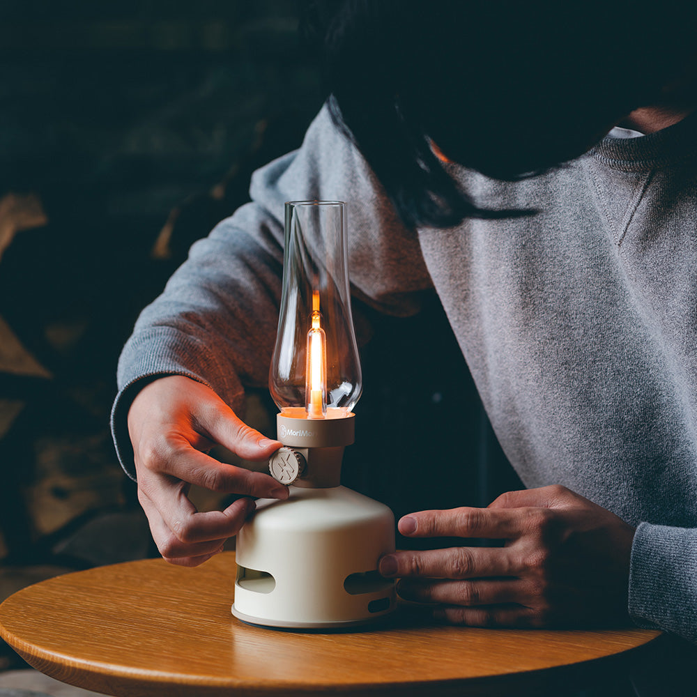 ガラスシェードの中で、ランタンの芯が燃えているかのように、LEDがやさしく光ります。ランタンの火力を調整するように、ツマミを回して明るさが調整できます。