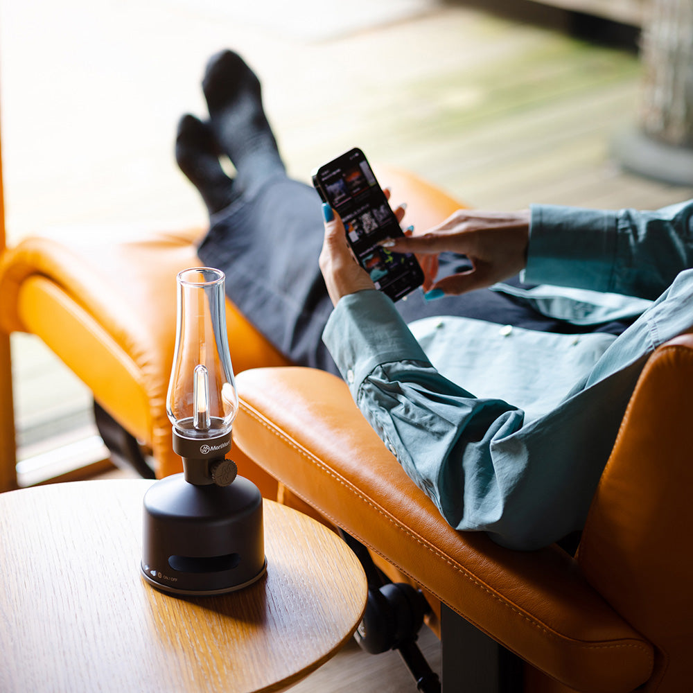 アウトドアでもインテリアとしても活躍する、カジュアルなランタンスピーカー。落ち着いた淡い灯りの調光可能なLEDライトとBluetooth(Ver.5.1)接続により音源を再生し360度全方位に広がるモノラル再生のスピーカーです。