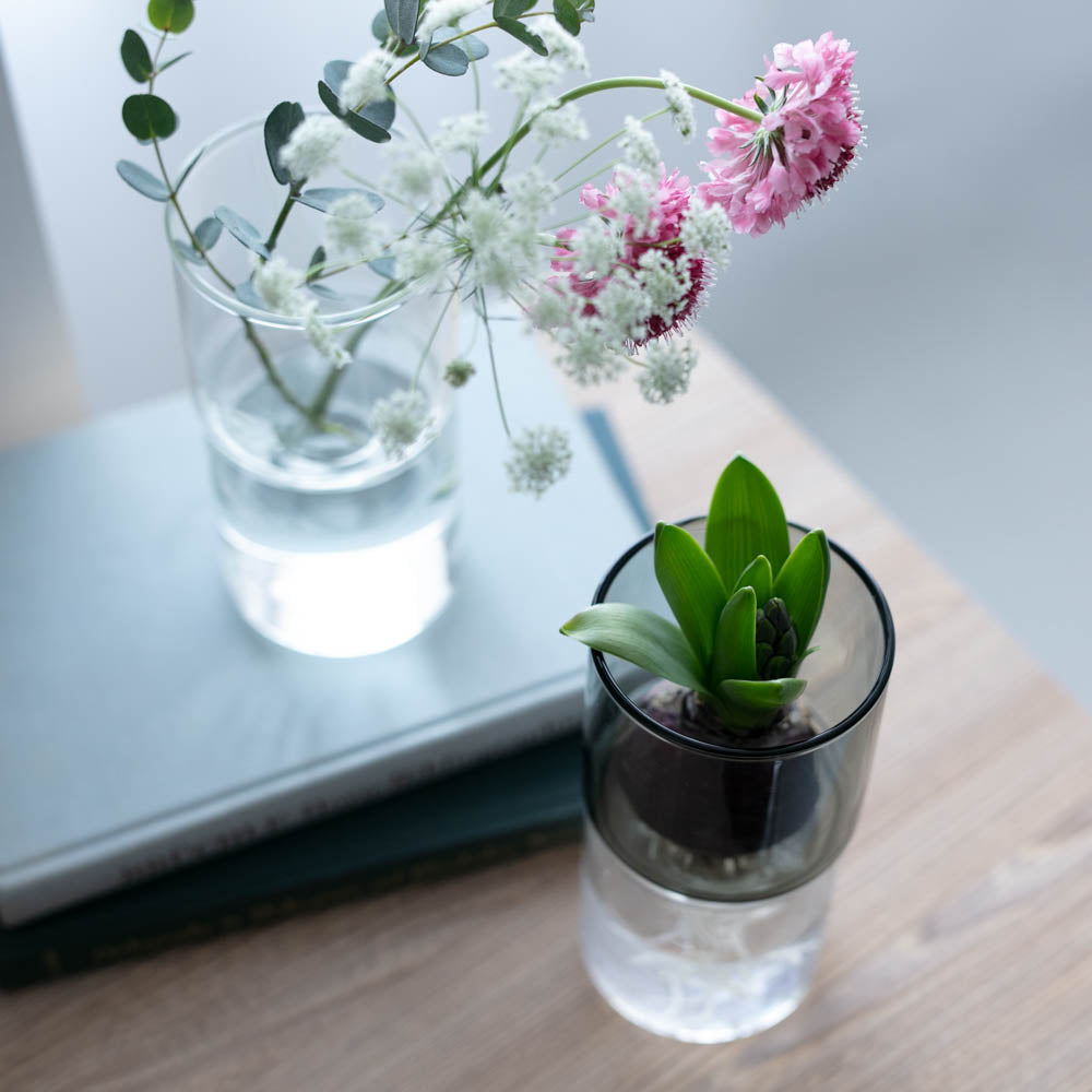 花器としてだけでなく、水耕栽培も楽しめる、2way仕様の耐熱ガラス製の花器。